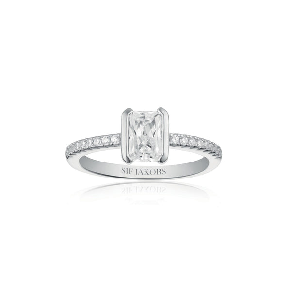 Roccanova bietet viele Varianten von Größen, von süßen kleinen Ohrringen bis hin zu massiven Statement-Ringen mit einem großen smaragdgeschliffenen Zirkonia, der die Köpfe drehen wird. Alle Steine sind in einer Spannungs- oder Tensionsfassung gefasst, die eine Technik verwendet, um den Zirkonia an Ort und Stelle zu halten. Dies erzeugt die Illusion, dass der Stein zwischen den Metallteilen auf elegante Weise schwebt.