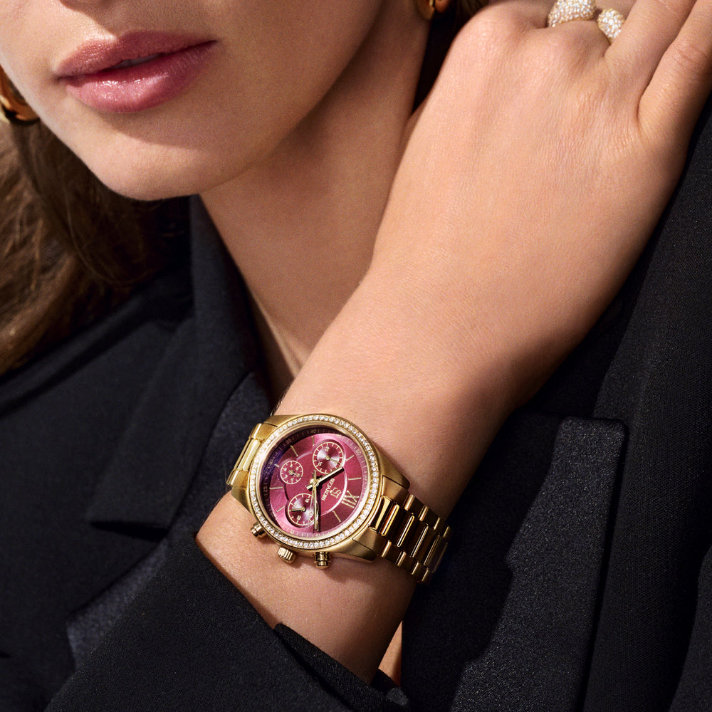 Uhr aus vergoldetem rostfreiem Stahl, polierte und gebürstete Oberfläche, mit Saphirglas und halbmattem weißen Zifferblatt, dekoriert mit weißen Zirkonia. Chronographenfunktion. Wasserdichtigkeit 50 m. Miyota Uhrwerk.