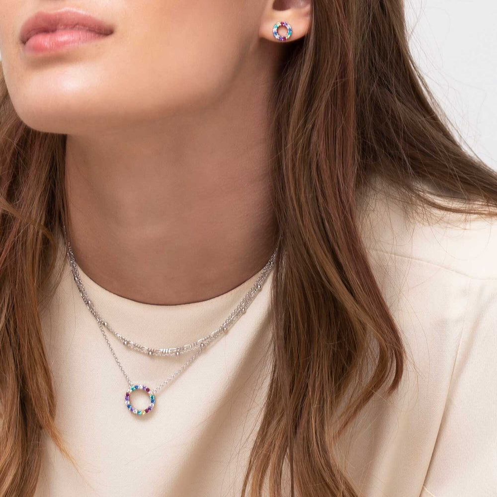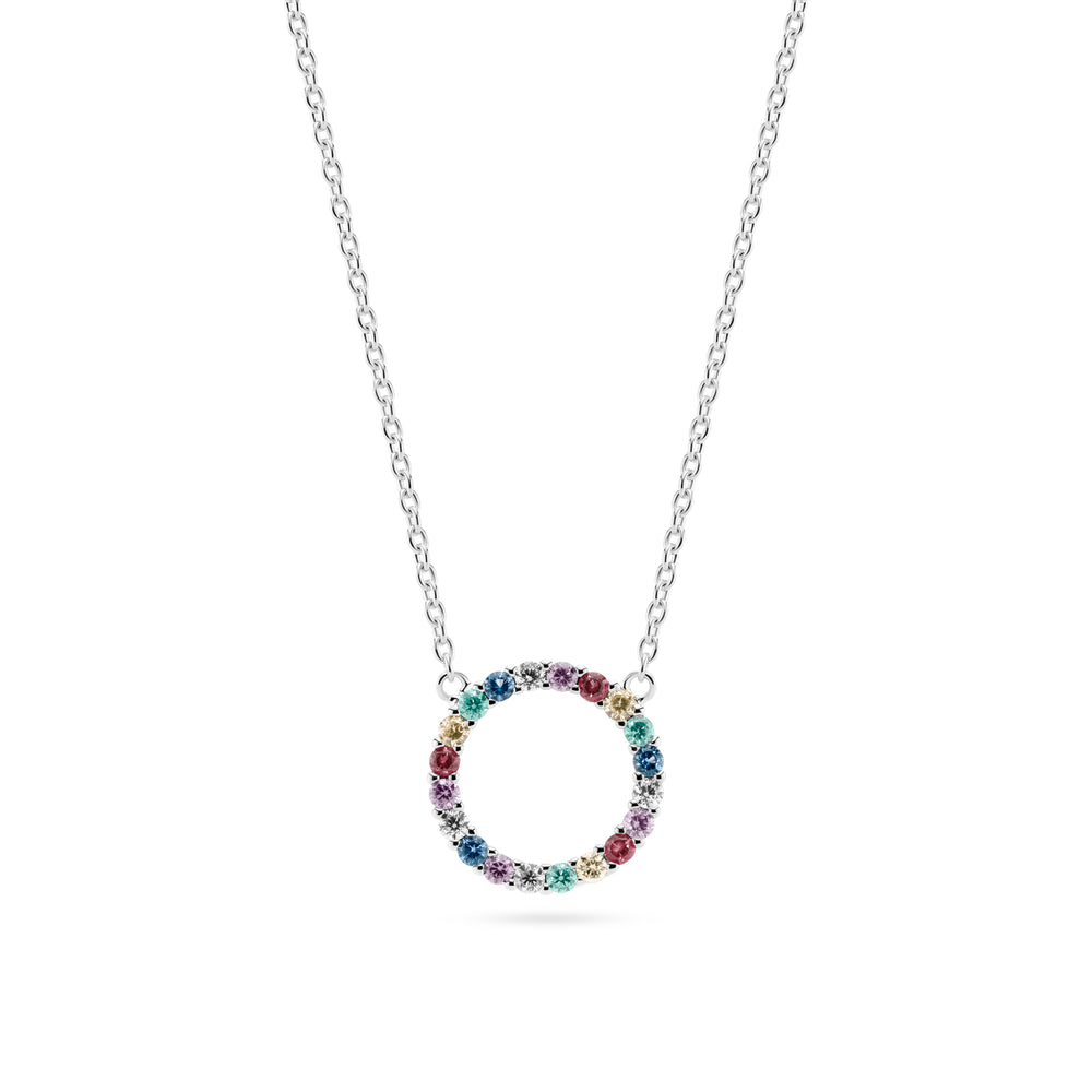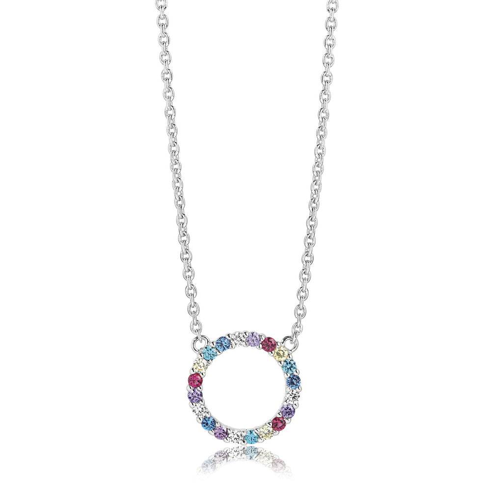 Halskette aus 925 Sterlingsilber mit glänzed polierter Oberfläche, facettengeschliffenen bunten Zirkonia und 45 cm Kette.