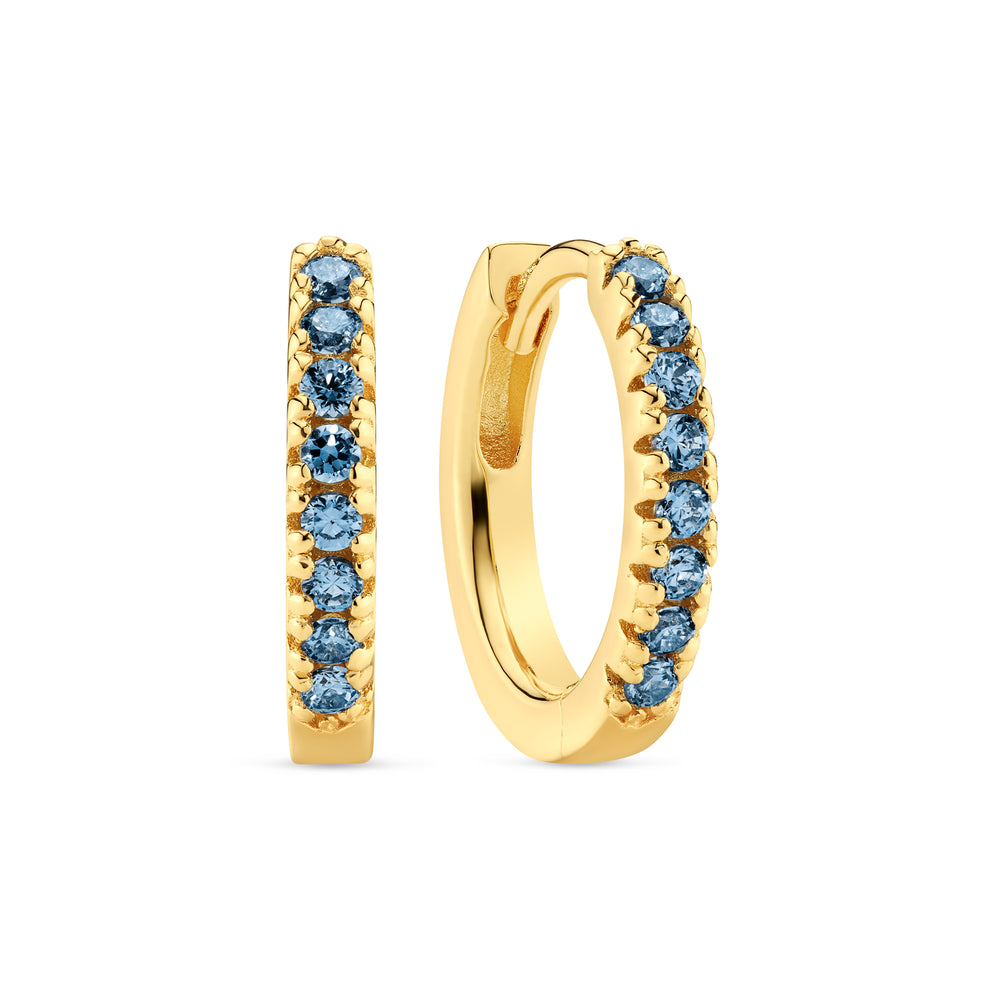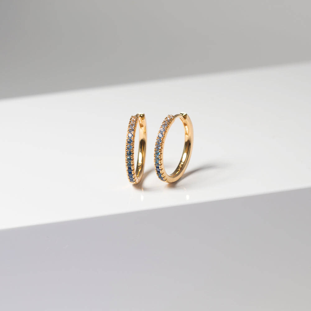Ohrringe aus 18 karätig vergoldetem 925er Sterlingsilber, mit polierter Oberfläche und handbesetzt mit Zirkonia im Facettenschliff in blau-weißem Farbverlauf.