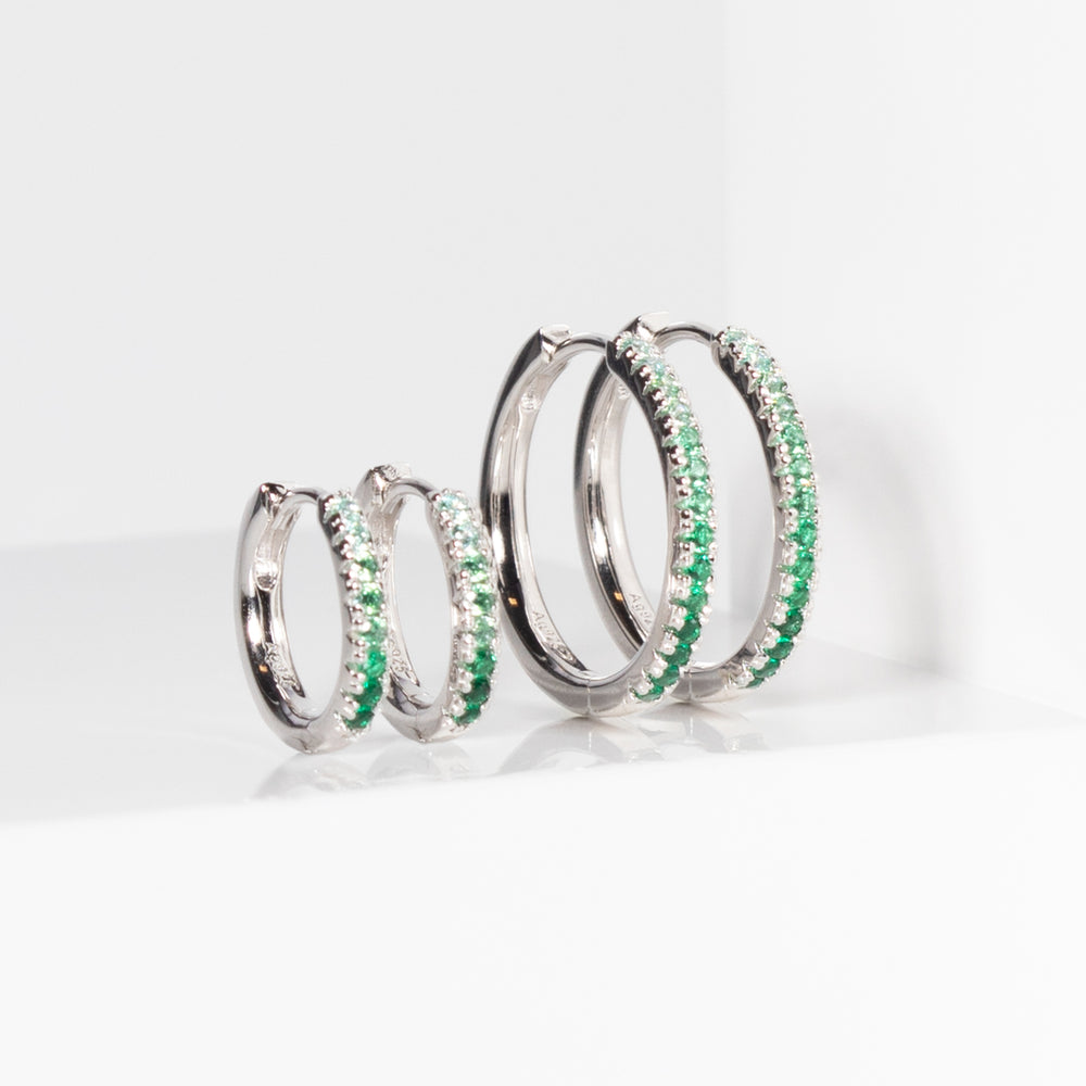 Ohrringe aus 925er Sterlingsilber mit rhodinierter, polierter Oberfläche und handbesetzt mit grüne und weiße Zirkonia im Facettenschlifff.