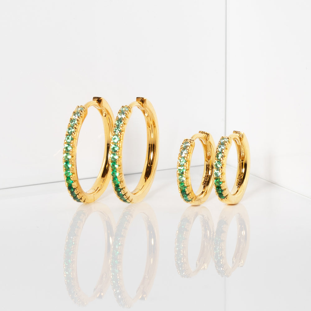 Ohrringe aus 18 karätig vergoldetem 925er Sterlingsilber, mit polierter Oberfläche und handbesetzt mit grüne und weiße Zirkonia im Facettenschliff.