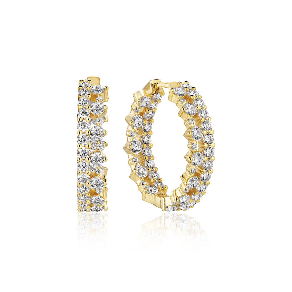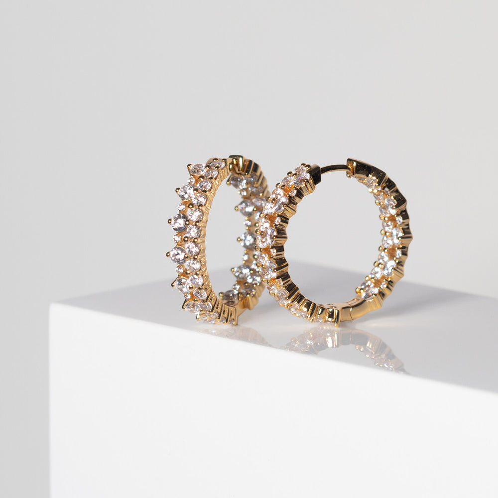 Ohrringe aus 18 karätig vergoldetem 925er Sterlingsilber, mit polierter Oberfläche und handbesetzt mit weißen Zirkonia im Facettenschliff.