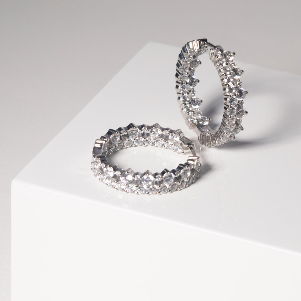 Ohrringe aus 925er Sterlingsilber mit rhodinierter, polierter Oberfläche und handbesetzt mit weißen Zirkonia im Facettenschlifff.