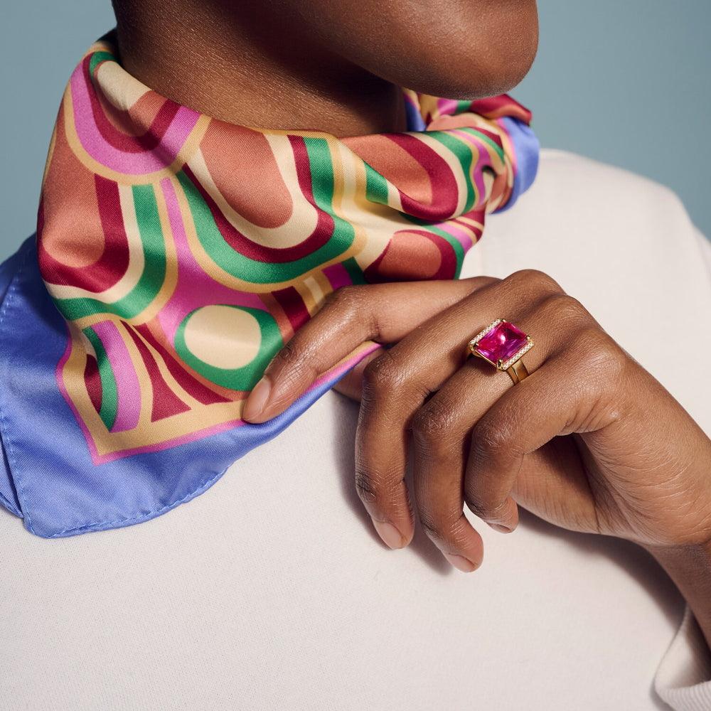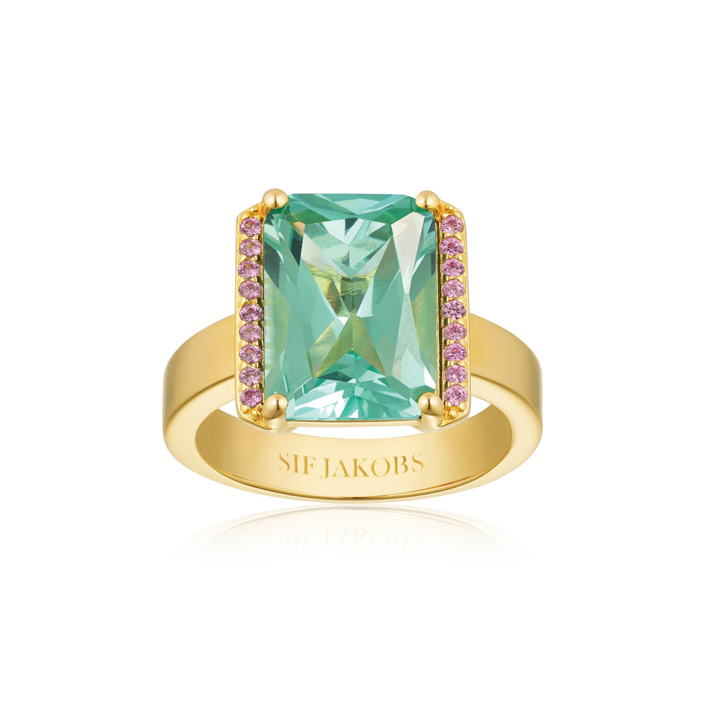 Statement Ring aus 18 karätig vergoldetem 925er Sterlingsilber, mit polierter Oberfläche und handbesetzt mit weißen Zirkonia im Facettenschliff und pinkfarbenen Zirkonia im Smaragdschliff.