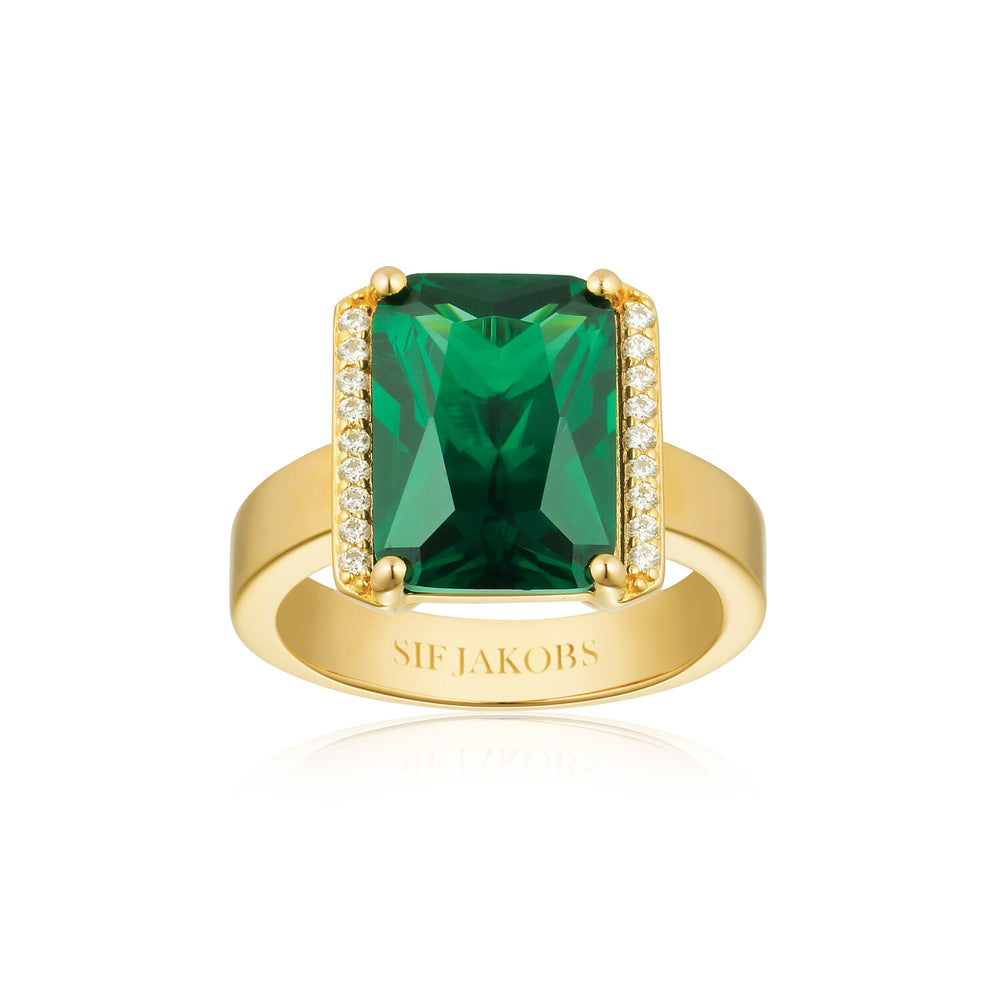 Statement-Ring aus 925 Sterlingsilber,18 Karat vergoldet, mit polierter Oberfläche, mit grünen und weißen Zirkonias im Facettenschliff und Smaragdschliff.