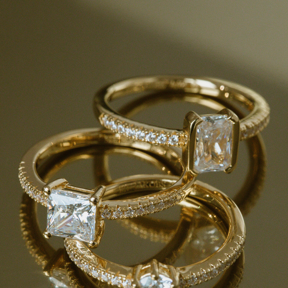 Ring aus 925 Sterlingsilber,18 Karat vergoldet, mit polierter Oberfläche und mit weißen Zirkonias im Facettenschliff und Smaragdschliff.