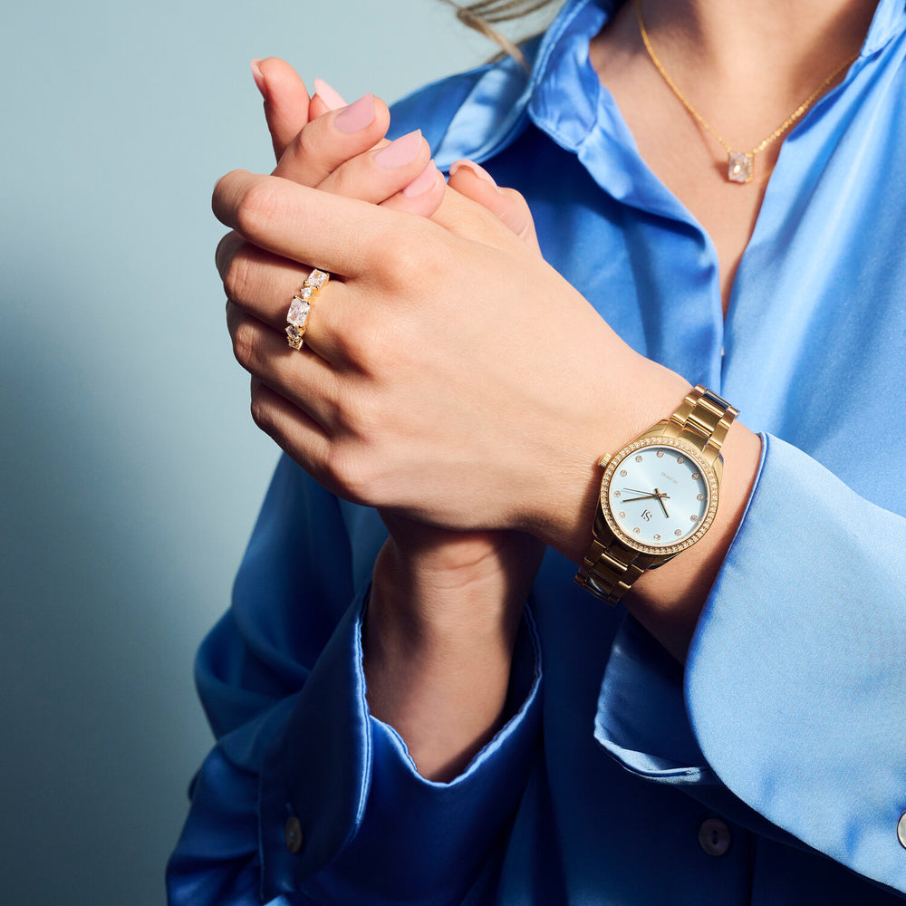 Uhr aus vergoldetem Edelstahl, polierter und geschliffener Oberfläche, mit Saphirglas und dunkelblauem Sonnenschliff-Zifferblatt, verziert mit weißen Zirkonia. Wasserresistent bis 50 m. Uhrwerk Miyota.